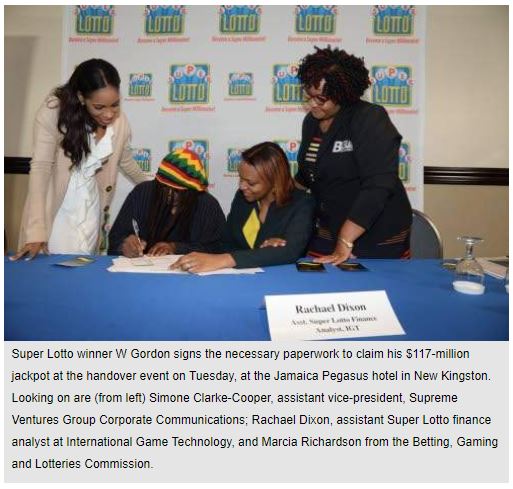 A 76-year-old retired parish council worker from Trelawny, on Tuesday took home a cheque for $117 million for winning a share of the June 16 Super Lotto.