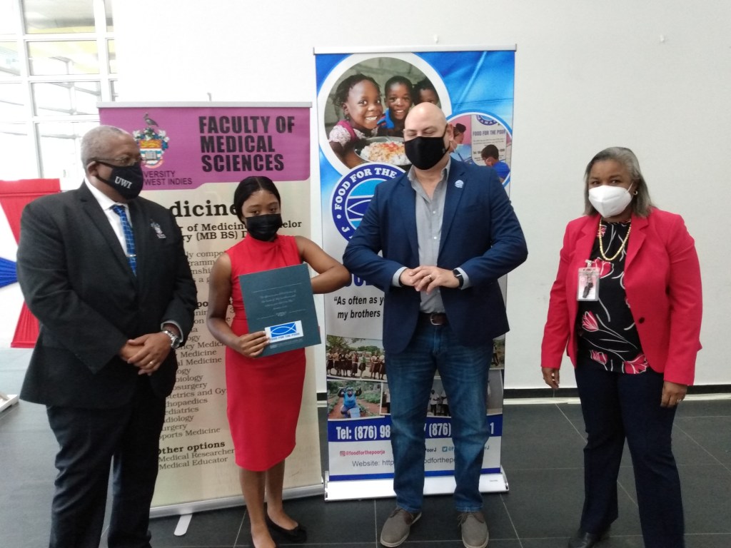 At the official presentation ceremony, held in the Medical Sciences Faculty building at the UWI, Mona campus, White, who hails from the remote mountain district of Auchtembeddie in Manchester (near to the St. Elizabeth border), gave an emotional testimony of the timely intervention of the Food for the Poor team, working in tandem with the Medical Faculty, and the overseas based donors. “This [scholarship] opportunity was a beacon of hope in what was otherwise a time of darkness,” she told the gathering. “I spent much time praying and crying, wondering if all the work and study I had put in up to that point would be in vain.”