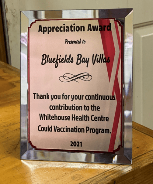 This Appreciation Award was presented by the Whitehouse Health Centre recently to the Bluefields Villas Foundation for their active support of the COVID-19 vaccination programme.