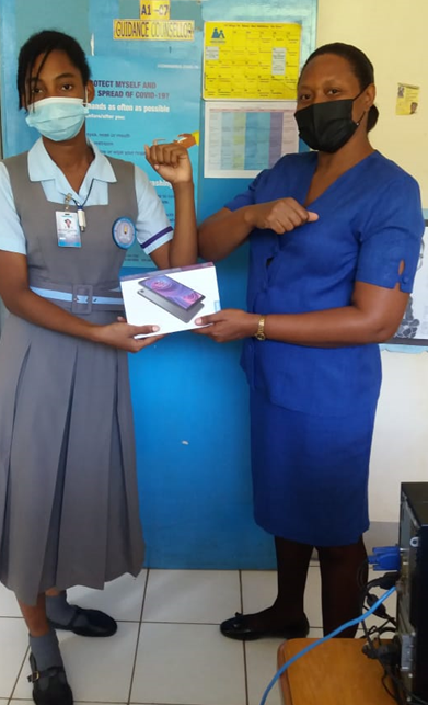 This student of Belmont Academy receives a tablet from Ms Anya Green-Johnson courtesy of the Bluefields Villas Foundation.