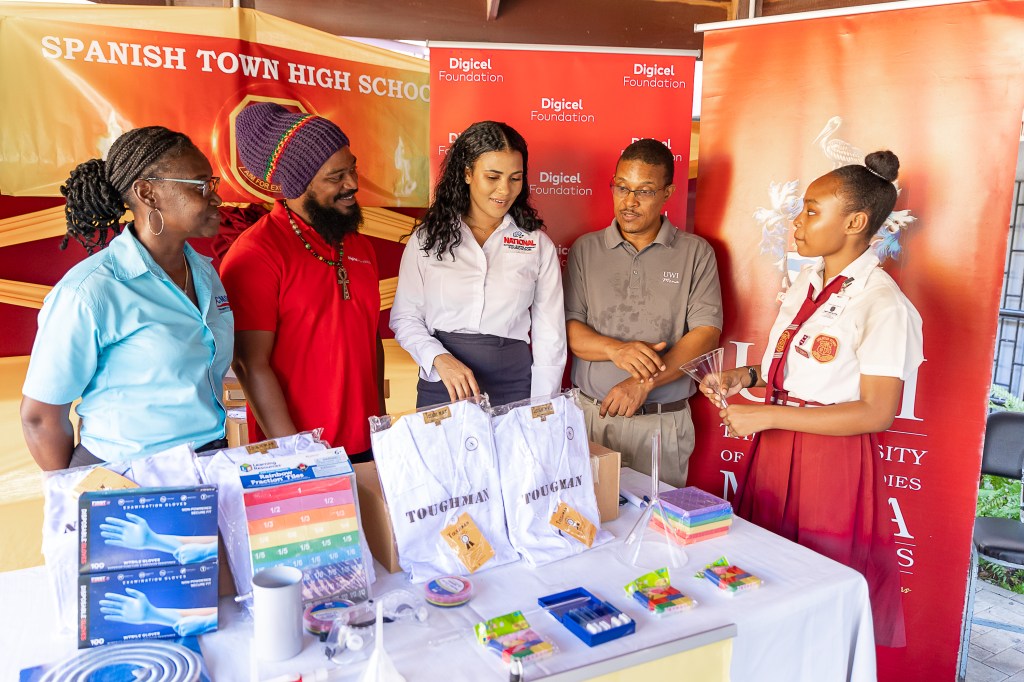 The Spanish Town High School, a participant in the National Baking Company Foundation’s (NBCF) Building Out Our STEM Teachers (BOOST) programme, has received a substantial investment in STEM equipment valued at $440,000. The donation, made possible by Digicel Foundation ($400,000) and Chemical Medical and Scientific Supplies (CMSS) ($40,000), was officially presented at a ceremony held on June 13 at the school. The handover represented part of the commitment of The UWI/NBCF BOOST programme to support schools where BOOST fellows are employed teaching STEM subjects. Pictured (from left) are Lisa-Kaye Hibbert, CMSS; Miguel Williams, director of strategic planning and community development at Digicel Foundation; Lauri-Ann Samuels, executive director, National Baking Company Foundation; Dr Andre Coy, associate dean, external engagement, Faculty of Science and Technology, The UWI, Mona; and Shevanese Grant, head girl, Spanish Town High School, on the occasion of the handover ceremony.