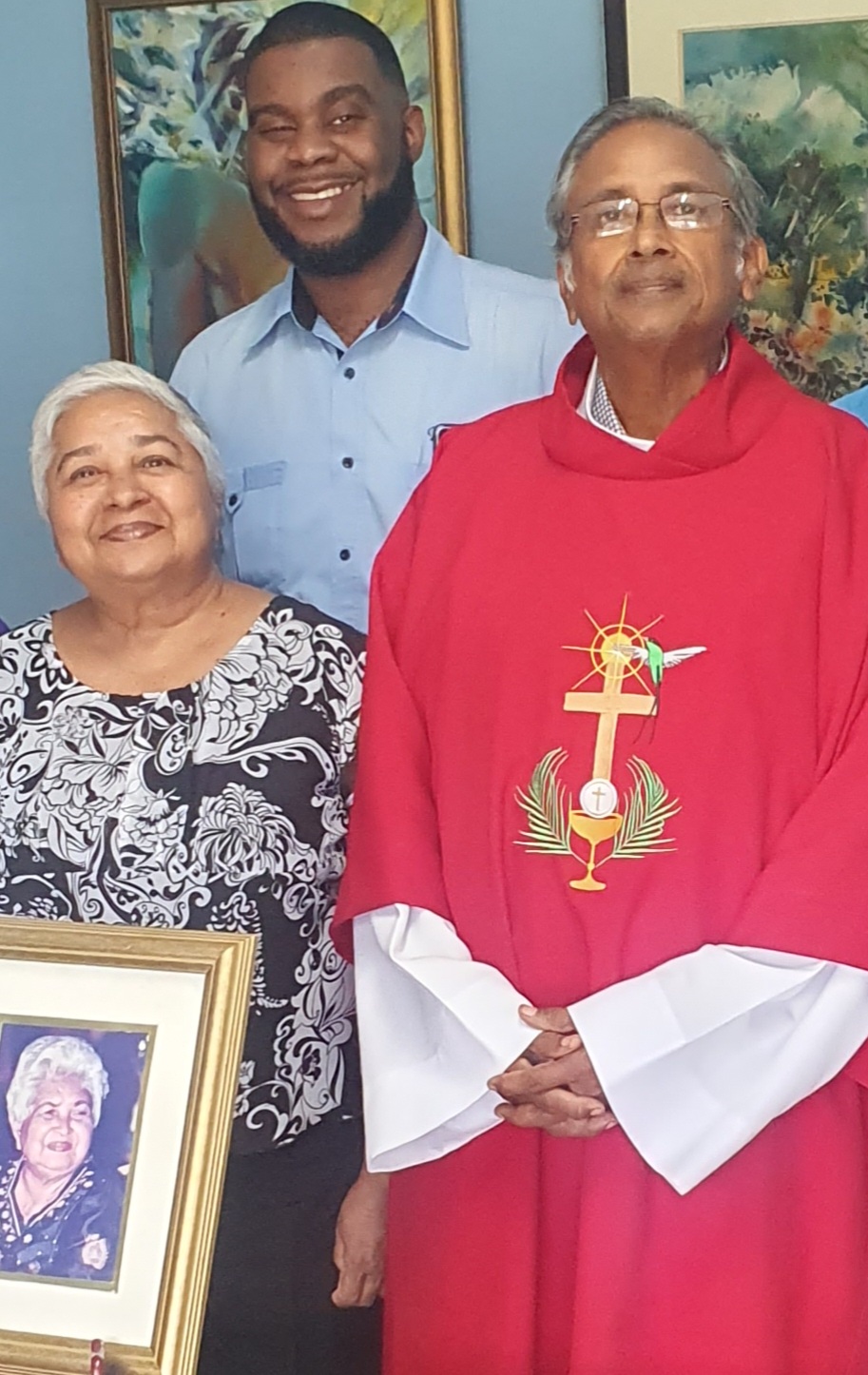 Deacon Sydney ‘Tony’ Lowrie with sister Sandra Lowrie and Godson and nephew Noel Chin, after blessing new equipment at PROComm.