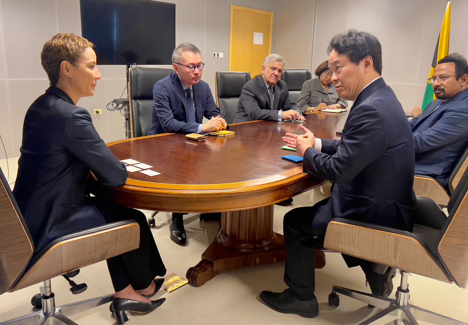 Minister of Foreign Affairs and Foreign Trade Kamina Johnson Smith in meeting with Marubeni senior executives Ryota Kobayashi, Damian Obiglio, Mohamed Majeed and Yuji Sato.