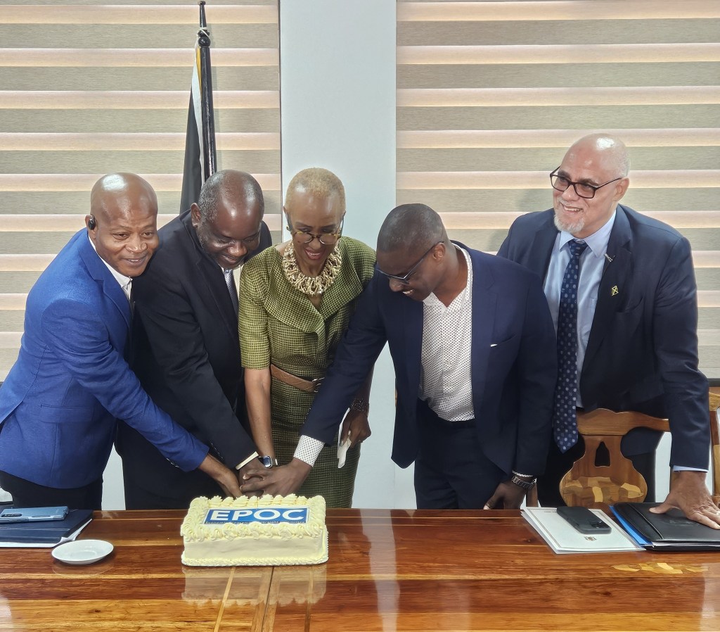 Finance Minister Fayval Williams cuts the EPOC celebration cake with (from left) Donovan Wignal, MSME Alliance, Courtney Williams, Fiscal Commissioner, Terron Francis, Ministry of Finance and Keith Duncan, EPOC Chair.