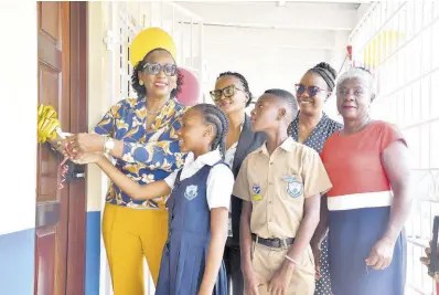 Chairman of the Digicel Foundation, Joy Clarke (left), cuts the ribbon to hand over a state-of-the-art smart room to the Black River Primary and Infant School in St Elizabeth, on March 27. Sharing the moment are (from left, foreground) head girl of the school, Melissa Campbell and head boy, Levaunghn Brown. In the back row (from left) are Vice Chairman of the Black River Primary and Infant School Board, Jennifer Mullings; Senior Education Officer in the Ministry of Education, Youth, Skills, and Information – Region Five, Nevadeene Gallimore-miller, and principal of the school, Sharon Whyte.