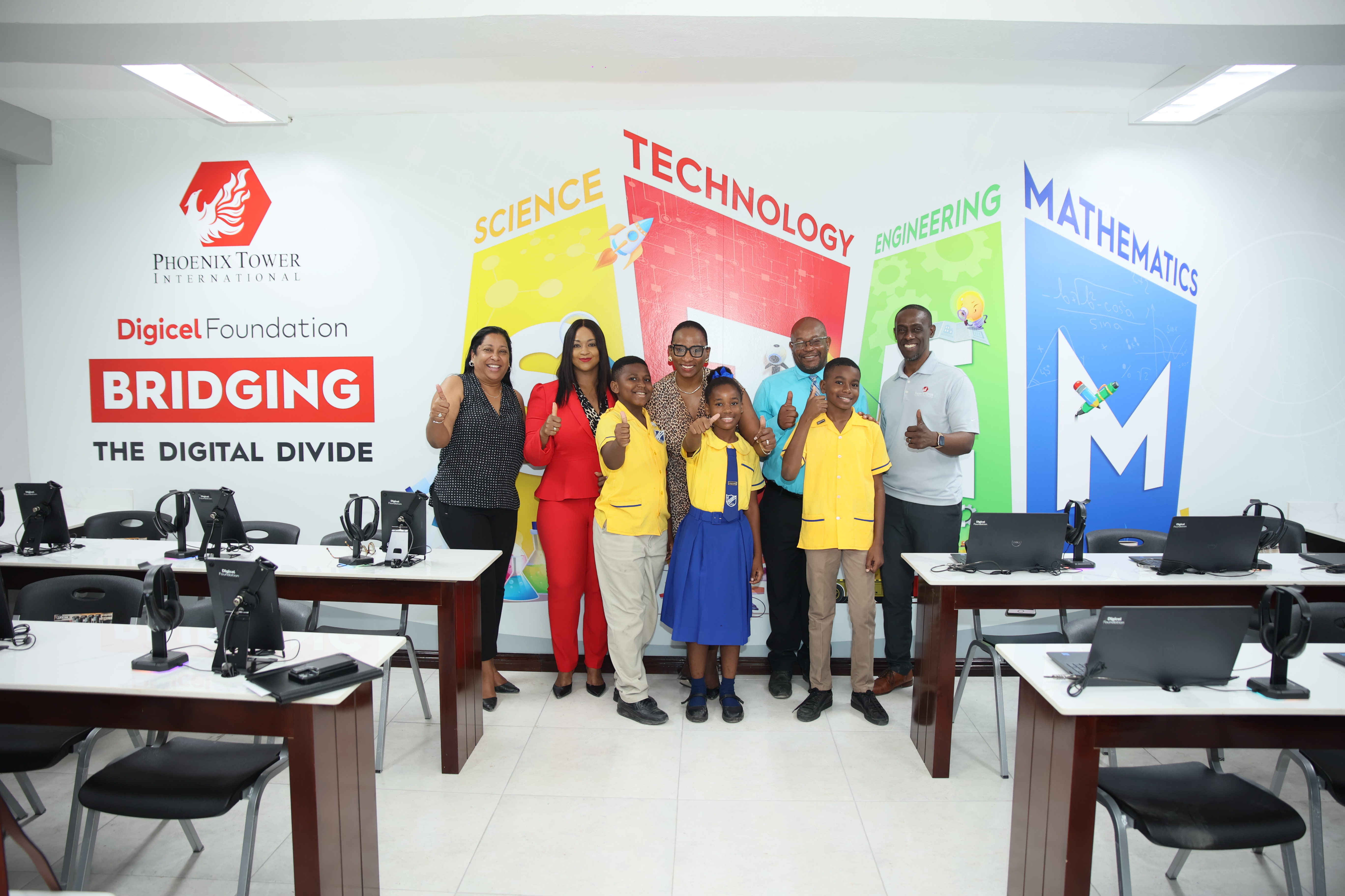 Thumbs up for Success! (L-R) Charmaine Daniels, Digicel Foundation CEO; Twitty-Ann Farquharson, Director of Sales, at Phoenix Tower International; Joy Clark, Digicel Foundation Chairperson; Kirk Spencer, Principal at Falmouth All-Age; and Carlyle Roberts, General Manager at Phoenix Tower International school stand with students to give an approving thumbs up to mark the opening of the Smart Lab at Falmouth All-Age.