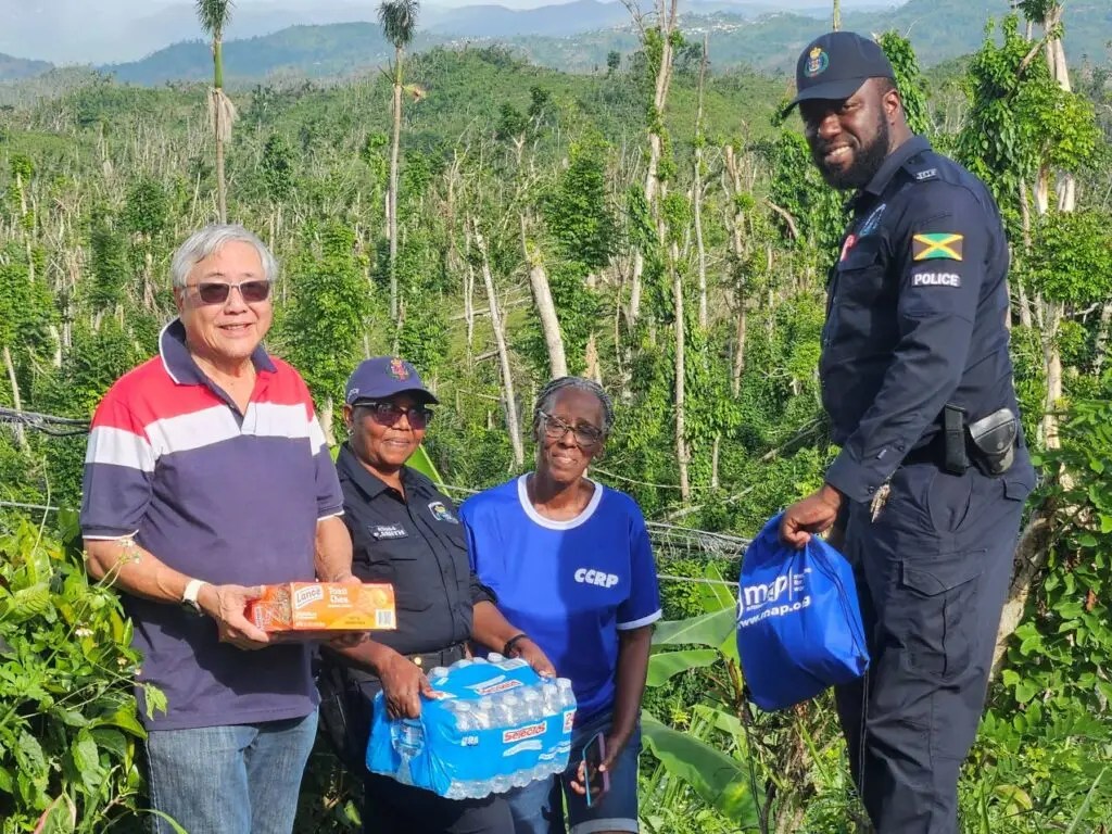 Two days ago we took care packages donated by Food For the Poor Jamaica to elderly folks in Darliston. Allen, my husband, and I were assisted by officers David Spence and Faye Smith from the Darliston Police Station, also badly damaged by the storm. Although electricity had been restored on Friday to a section of the business area, neither Allen nor the police had power, as many lines were still down.