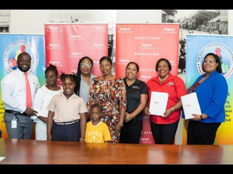Gathered to serve the needs of the students of Bull Bay Infant and Primary School are (from left) Lanceford Grant, education officer at the Ministry of Education and Youth’s Region 2; Esther McFarlane-Smith, school principal; Jodi Bernard Kerr, board chair; Terri-Kay McKoy Holmes, academics staff rep to the board; Charmaine Daniels, CEO of the Digicel Foundation; Tanisha Miller, acting on behalf of the executive director of the Early Childhood Commission; Karlene DeGrasse Deslandes and Yashieka Blackwood-Grant, acting director of Regional Educational Services, Region 2 and two students (front row) after signing a memorandum of understanding for the renovation of the infant section of the St Thomas-based institution.